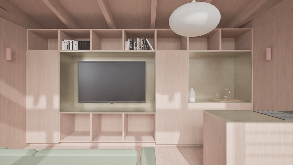 Rather than a single-purpose addition, the project required a highly adaptable environment. The proposed studio was designed as a multifunctional space that could operate independently as a private retreat for the children, a recreational area, or guest accommodation, while also having the capacity to become the clients’ primary living space in the future. Flexibility was central to the design: mobile joinery on concealed wheels allows the interior to be reconfigured as needs change, while provision has been made for fixed joinery to be introduced when the studio transitions into a permanent dwelling. A largely open-plan layout is complemented by large sliding doors, enabling the space to be divided or opened up as required for privacy and varied uses.